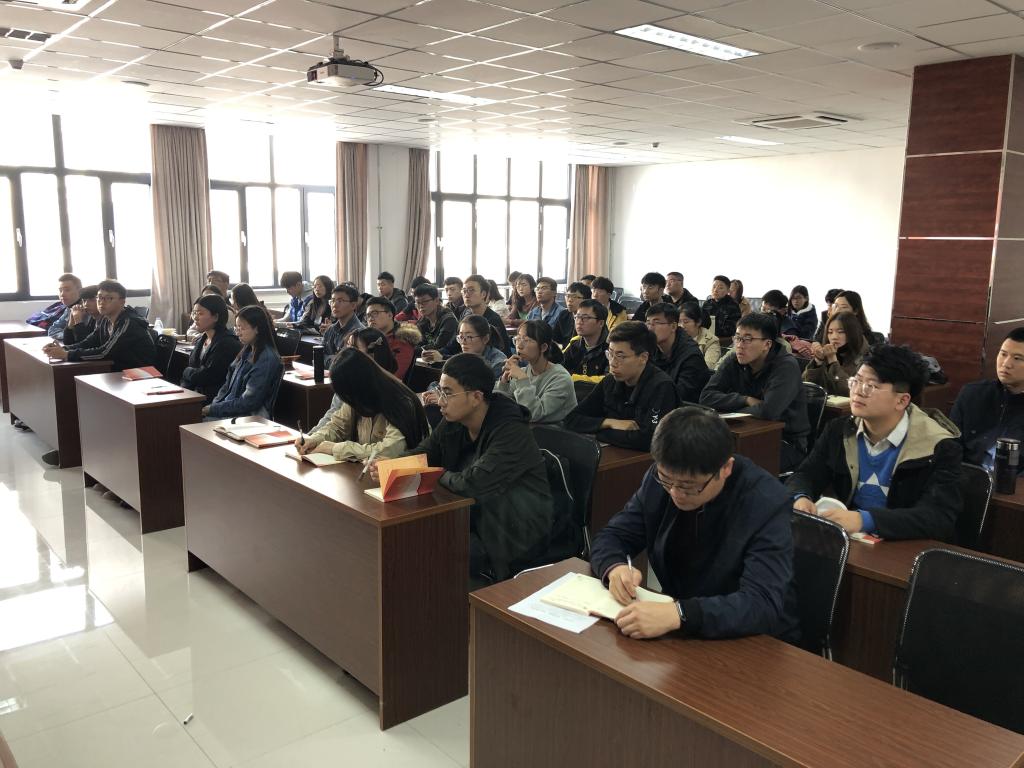 党总支书记郭仲聚在410会议室为全体学生党员上党课,党课由党总支副书记马寒主持。