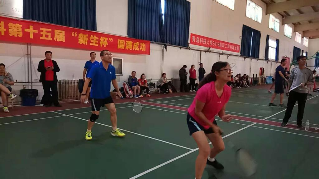 青岛科技大学第三届羽毛球比赛于10月23日下午在四方体育馆拉开了序幕。我院由黄翼虎、张涛、赵波、李莺歌、樊春玲、陈静、余新宁等教师组成参赛队伍,分别与材料学院、海泮学院、信息学院展开女双、混双、男双项目循环赛。选手们个个精神饱满、顽强拼搏,团队协作意识强烈,所有选手尽情施展技艺,各种战术的灵活运用,现场对决异常紧张激烈,特别是男双,令比赛精彩纷呈。赛场上,换上了轻便运动装的同事们,变成了活力四射的运动员,尽显风采,将高远球、扣杀、劈杀、吊球等各路球技展现的淋漓尽致;赛场下,大家的又是尽职的啦啦队,喝彩声、加油声、欢呼声此起彼伏。选手们遵循友谊第一、比赛第二的原则,赛出了风格,赛出了水平。