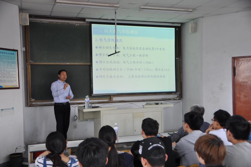 、继电保护专业特点、继电保护科研简介和个人体会与展望四个板块做了详细介绍;过程中,结合自身多年教学与科研工作的经验,旁征博引地阐述了继电保护专业特点,并就继电保护研究对象,配套实验室建设,以及山东大学继电保护研究所的建立历史、科研成果、研究方向做了详细阐述。在体会和展望环节就自身多年科研心得、本科和研究生的科研定位、山东大学电气学院研究生招考情况与师生进行了互动交流,高教授精辟独到的见解赢得了现场阵阵掌声与好评。