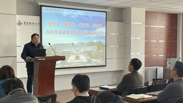大会上,池荣虎传达了《青岛科技大学2021年党政工作要点》和《2021“干事创业攻坚突破”重大任务》等文件内容,并就学院2021年工作部署进行了汇报,全面推进教学管理、学科建设、教学和科研团队建设、一流学科、一流课程、学科竞赛、博士点申报、国际办学,以及岗位聘任、职称评审等工作。鼓励全体教职工凝心聚力,攻坚突破,形成合力,使学院发展上一个新的台阶。