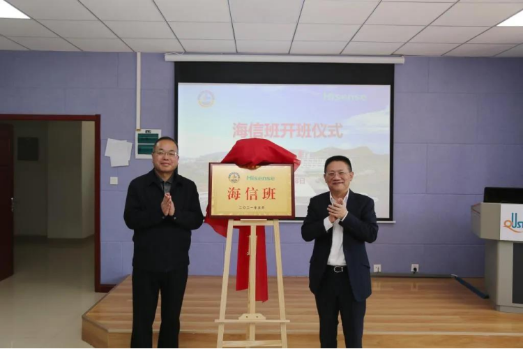 4名、机电工程学院21名、高分子科学与工程学院2名、信息科学与工程学院1名同学。对于首批成员,海信集团高度重视,专门为班级设置奖学金和科技创新奖金、定制课程、制定实习实训计划、定期开展素质拓展活动、配备技术项目导师等等,为首批同学配发了漂亮的T恤衫,开班仪式当日,企业为每名同学发放了精美的礼品。该班级实行校企协同管理,选聘企业和学校的优秀管理人才担任双班主任,校企双方期望,通过名企班的运行,为“千里马”和“伯乐”搭建一个更有效更快捷的对接平台,共同培养德智体美劳五育并修的青科大人。