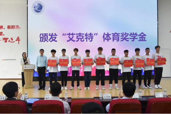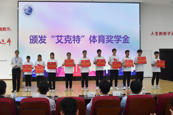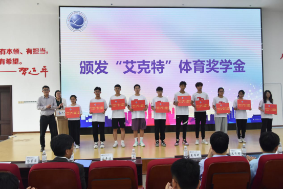 池荣虎宣读运动会表彰决定,毛常明、曹永俊、安丰波为学生颁发“艾克特”体育奖学金。