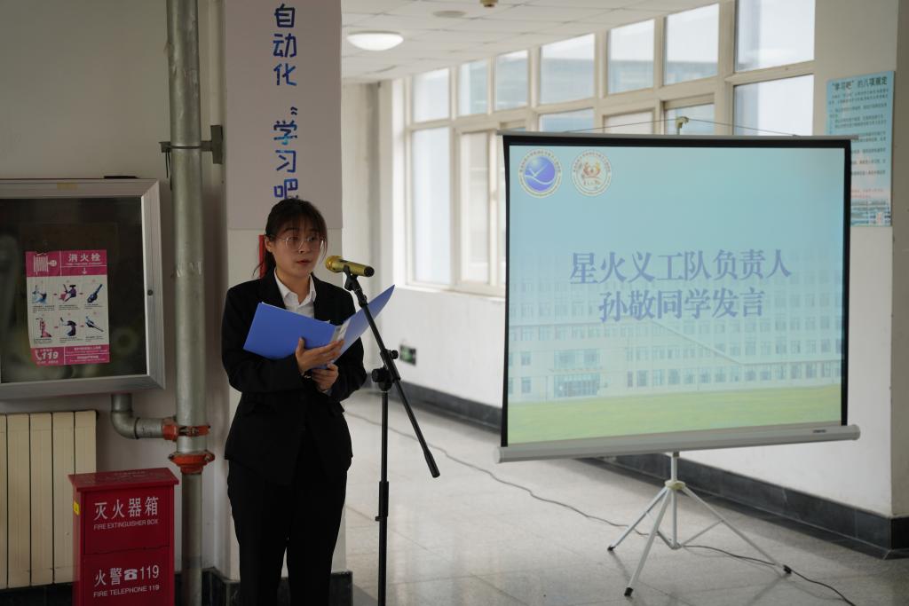 星火义工队负责人孙敬回顾总结了过去三年以来义工队参与的各类志愿服务活动,并表示义工队一直以来坚持“自愿参与、量力而行、讲求实效、持之以恒”的服务原则,发扬“奉献、友爱、互助、进步”的志愿者精神,将义工活动落实于社会和学校。孙敬代表全体成员对实践基地未来的发展予以展望,立志全体志愿者将持续投身志愿服务当中,向外奉献社会,向内服务学校,用热情点亮明天。