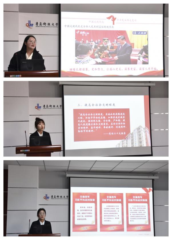 庞靖、李婷婷、吕靓、王云敏、申文理、于洋六位宣讲团成员分别围绕不同主题展开宣讲。庞靖、李婷婷把握“学雷锋志愿服务月”这一重要时刻,以“传承雷锋精神,弘扬时代新风”为重点展开宣讲,结合“中华民族伟大复兴”、“贯彻落实新思想”等方面,引导青年学子“坚定理想信念,牢记为人民服务”、“坚持终身学习,保持进取锐气”、“坚持实事求是,勇于开拓创新”,生动诠释了党的二十大精神和新时代雷锋精神的践行与落实;吕靓、王云敏结合中国青年的时代特点,突出中国青年的“守正”与“创新”,探讨了青年担当时代使命的必要性以及应如何担当时代使命;申文理围绕“为何要推进文化自信”和“怎样推进文化自信”两个方面展开具体讲解;于洋则以“守好绿水青山坚持人与自然和谐共生”为题,结合党的二十大报告重点内容解读,呼吁广大新时代青年以实际行动贯彻可持续发展理念,为建设美丽中国贡献力量。