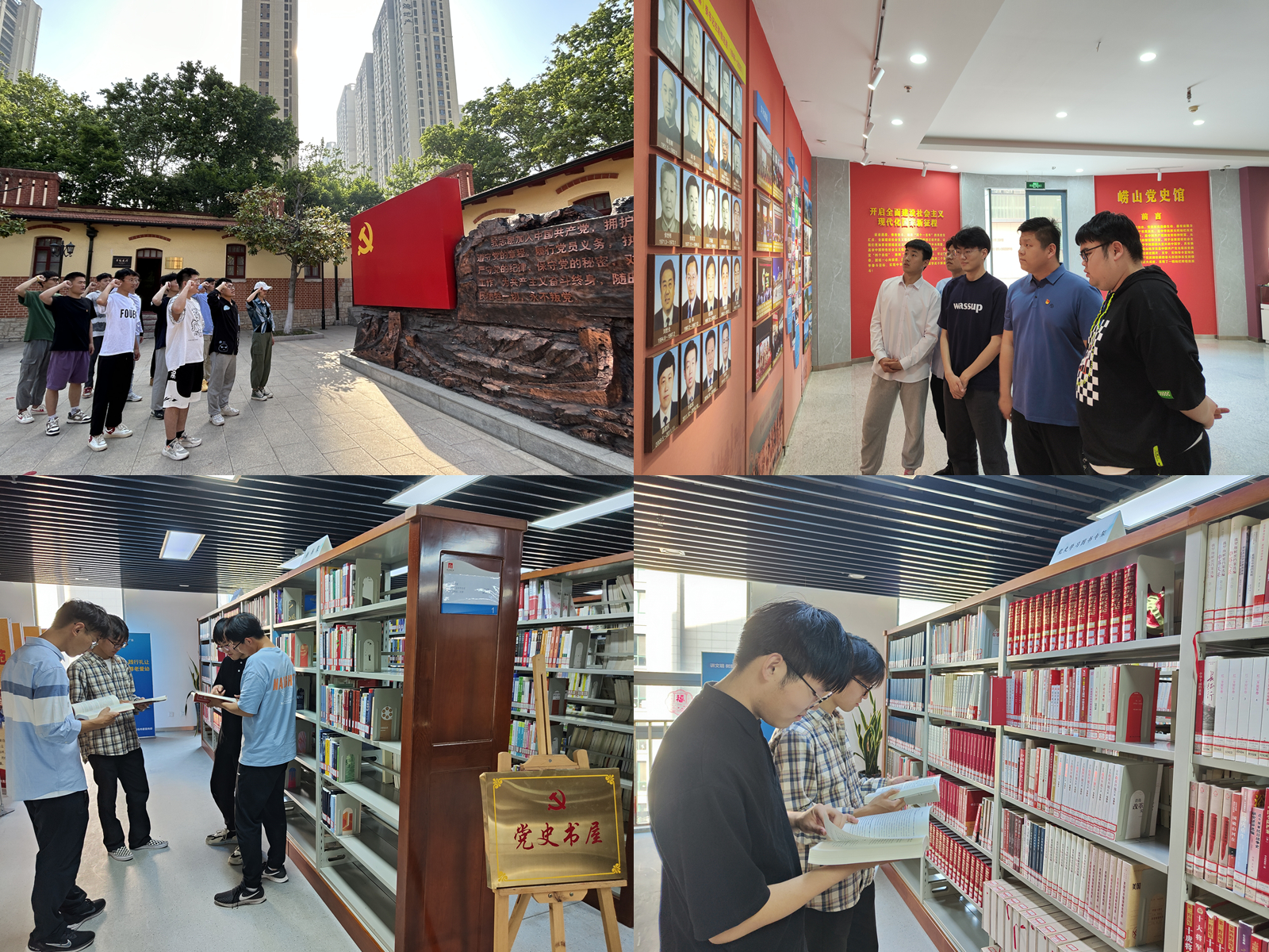以知促行,打造红色研学特色。为丰富学习形式,提升理论学习的实效性,在主题教育中充分发挥红色资源的铸魂育人功能,学院创新打造“AI领航——红色研学系列活动”,让理论学习与调查研究在“行走的主题教育课堂”中有机融合,让主题教育“活起来”。学院师生党员、团员青年、学生骨干等广泛参与、自主选题、创意实践,先后前往多处红色教育基地、党史学习教育基地开展红色研学活动。在中共青岛党史纪念馆,学院党委本科生第一党支部参观了基本陈列展厅、革命文物精品展等,深入学习青岛党组织奋斗历程和先烈们英雄事迹。师生党员们驻足于一件件历史文献、实物和照片前,在全景式参观中重温那段波澜壮阔的峥嵘岁月,领略革命文物的历史底蕴,感悟先辈革命精神。在党旗前,全体党员庄严重温入党誓词,铿锵有力的誓言是同志们对先辈的承诺。在崂山区党史馆和党史书屋,师生们共同围读《习近平著作选读》、《习近平谈治国理政》等书籍,全面学习领会习近平新时代中国特色社会主义思想的科学体系、核心要义、实践要求。同时,带着理论学习的收获体会深入实践,在崂山区党史馆重温了邓恩铭、李蔚农等革命先辈的党史清廉故事,从一件件珍贵的史料中再次见证了青岛党组织苦难辉煌、波澜壮阔的奋斗历程,体悟青岛地区共产党人不忘初心、牢记使命的伟大精神。青年党员范家兴表示,主题研学活动创新了“沉浸式”学习形式,“激活”了青年党员们的红色基因,在研学过程中学子们满怀激动与敬佩之情。作为新时代青年应当牢记历史使命,勇担时代责任,珍惜先辈们的革命成果,为实现中华民族伟大复兴而努力奋斗。