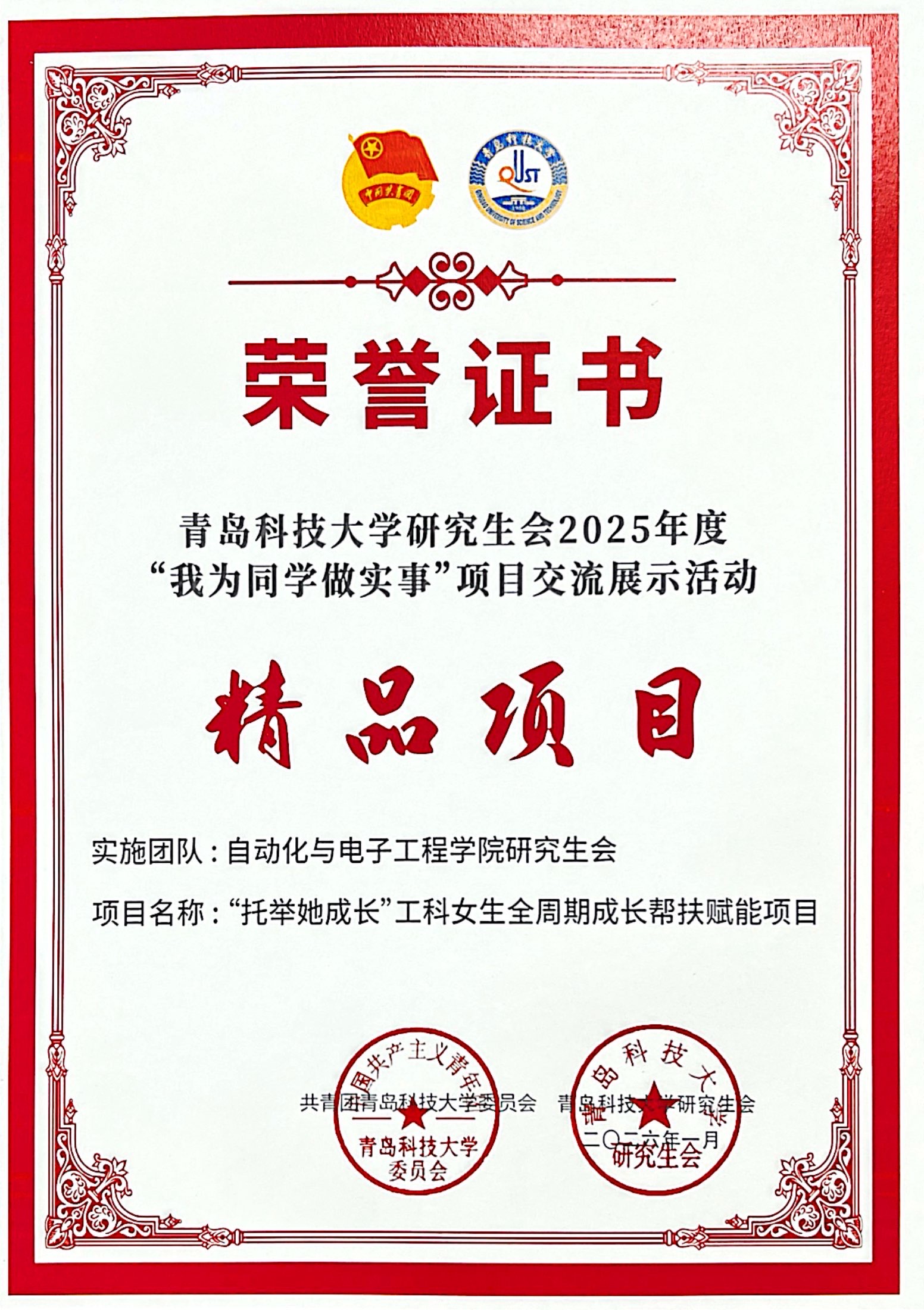 学生会获评“2025年度先进学生会”,学院研究生会“托举她成长”工科女生全周期成长帮扶赋能项目入选年度“我为同学做实事”精品项目,以两项荣誉彰显学院学生工作的扎实成效与创新活力。