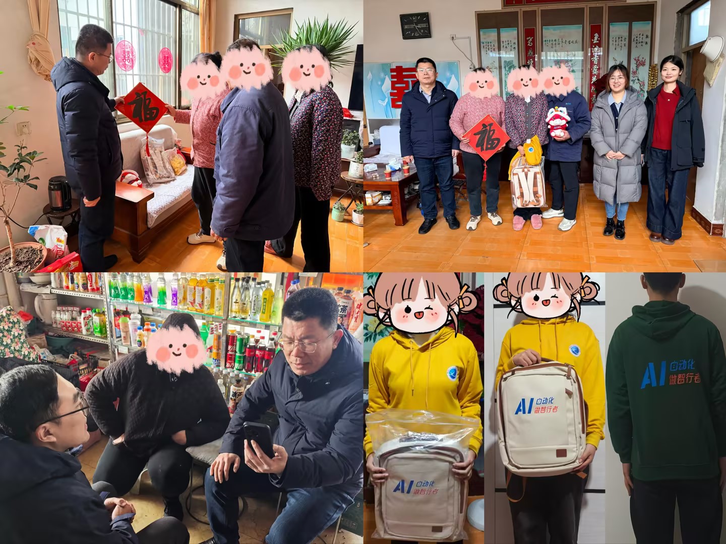 交流中,王震十分关心学生的在校表现,细致了解其学业成绩、综合素质提升及参与校园活动等情况。学生向校长详细汇报了假期学习规划、学科竞赛备赛进展并现场展示了自主设计制作的科创作品,表达了对专业的热爱与对未来的憧憬。王震对学生自立自强、勤学善思的精神状态给予肯定和赞扬,勉励她要始终保持积极向上的心态,勇于直面困难、砥砺品格,深耕专业知识、精进科创技能,用优异成绩回报家庭、母校与国家。走访现场,王震为学生家庭送上了米面粮油等生活必需品以及“青科出品”的新春福字,徐华代表学校为学生送上专属保险。学院还特意准备了“AI自动化,做智行者”学生工作品牌文创卫衣、背包、马年吉祥物等特色礼物,让学生和家长在寒冬中深切感受到学校和学院的浓浓暖意与深切关怀。