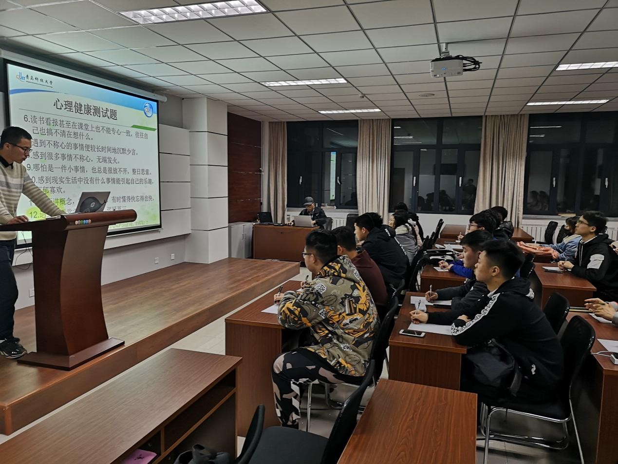 讲座由电气171班的张忠进主讲,心理协会宣传部主持。张忠进从心理健康的概念入手,引申到盖伦气质说,为大家解剖大学生经常出现的心理状态,进而对心理健康水平进行划分。