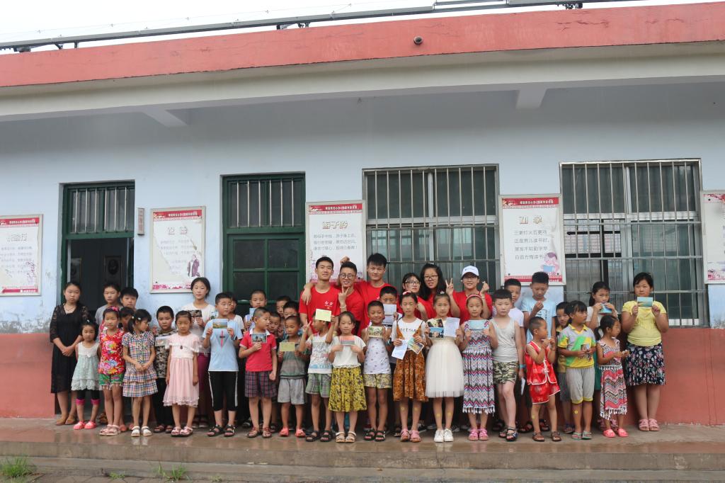 第二项是赠送明信片,让孩子对青岛有一个美好的印象。调研团拿印有青岛特色景点和青科大的明信片,赠送给孩子们,并向他们介绍卡片上的景点及文化背景。可以看得出,孩子们听得很认真,对青岛充满了向往。那些曾经去过青岛的孩子表示,希望以后可以像调研团成员一样在青岛上学,体会大城市的美好。在见面会的最后,调研团给孩子们发放了小礼物。