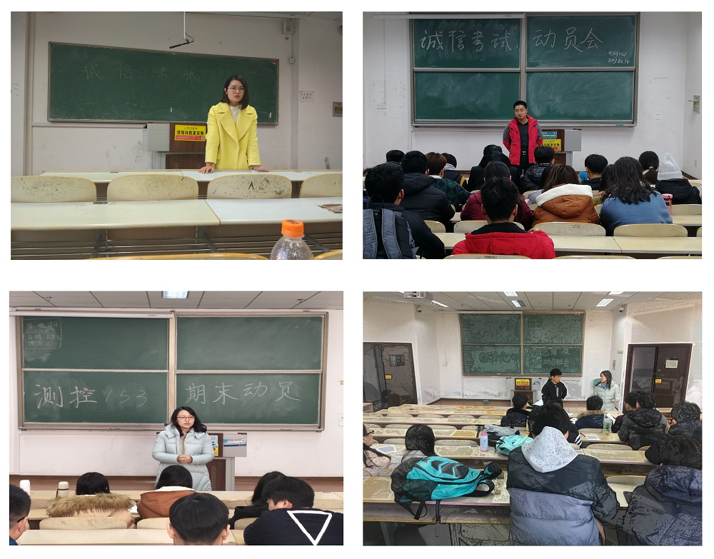 测控151、152班两班级以模拟考场的形式模拟考试现场,结合以往出现的考试问题及处理办法告诫同学们要严肃对待考试,诚信考试;自动化152班则通过宣读《学生手册》青岛科技大学学生行为规范细则第六条以及青岛科技大学学生纪律处分管理规定的相关条款,强调违规舞弊行为的后果和严重性;自动化157班对大学生活中各种不诚信的现象及后果进行讨论,以此警示同学们诚信做人的重要性。各班级成立学习互助小组进行互帮互助,并将根据期末考试对成效明显的学习小组予以表彰。