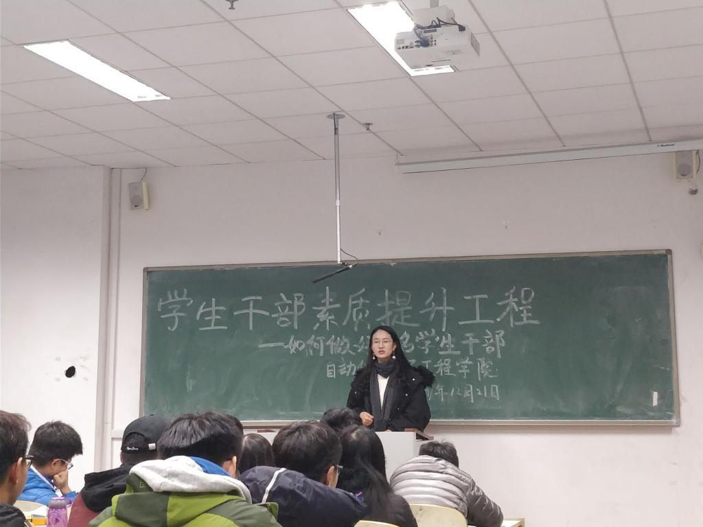 测控171班的班长丁绥牧和团支书铁雅雯在会议上总结了他们在班级管理方面的失误教训。他们说,身为学生干部,要时刻保持清醒的头脑,尤其是对待班里学生的各种问题上,要有足够的重视程度。电气3+4 171班的杨文佳同学向大家分享了旁听测控171班班会时刘海波老师在大学时期担任班长的心得体会:一是学生干部要有魄力,在工作中不断思考,在思考中不断完善;二是学生干部要起到模范带头作用,即火车跑得快,全靠车头带;三是学生干部要慎独,做到群处守住嘴,独处守住心。相信这三点会对学生干部们有着很大的帮助。