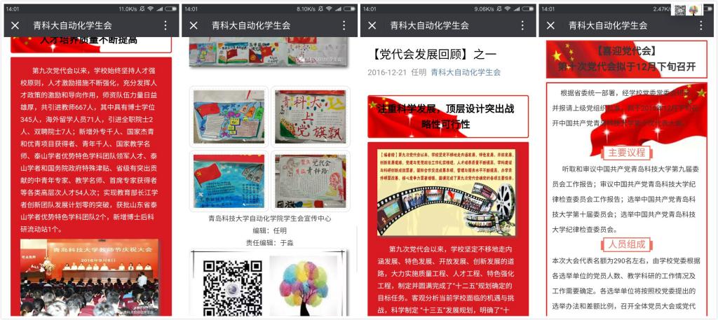 为迎接党代会的召开,学院学生会于12月上旬开始在学生会微信平台上推送有关学校第十次党代会的消息和新闻,营造了喜迎党代会的氛围。2016级各团支部积极响应高校共青团改革,坚持“凝聚青年、服务大局、当好桥梁”的原则,开展了团干部联系宿舍、帮扶同学的“暖心行动”暨班长、团支部书记要联系好一个宿舍,帮扶好一名困难同学,通过提出具体帮扶措施,以达到宿舍融洽、班级和谐、学风优良的目的,用实际行动向学校第十次党代会献礼。