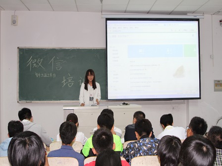 作为当今时代的一种新媒体工具,微信充分展现了它独特的魅力。开讲时,培训主讲人陈鹏向新进干事简略的介绍了微信平台的特点,从而让干事进一步认识到新闻可以通过微信这种互动平台,加以图片、语音、视频等形式,冲破时间、空间和其他因素的障碍,进一步畅通学院与学生的沟通交流。陈鹏的讲解为新进干事打开了一个更高层面的窗户,不再单单将微信置于“聊天”这一个用途,为干事将来更好的掌握新闻写作技能提供了一条便利之径。随后,王晓萌就微信公众平台简介及其后台运作做了精要介绍;并且向干事们推荐了数个较好微信公众号,供他们学习。最后,王晓萌进一步解答了部分干事对微信略感迷惑的问题,并且分享了自己的使用经验,活跃了现场的气氛,调动了干事的积极性,使彼此之间相互交流了自己对微信的认知和经验。