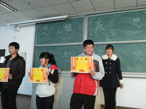 下午四点班会准时开始。首先由班长薛祎对班级从开学到现在所取得的成绩进行了总结,鼓励了辩论赛足球队演讲比赛象棋比赛户外文化节宿舍文化节等活动的参赛人员。然后由副班长总结期中考试的情况,并号召大家为即将到来的期末考试做好充分的准备。接下来团支书为在期中考试中取得优异成绩的同学颁发奖状,台下响起了热烈的掌声。班会有条不紊的进行着,学习委员就大家最关心的学分和挂科问题进行了补充说明,提醒大家不要把及格作为目标,使大家认识到大学学习也绝不能懈怠。为宣传学校即将举行的“五个文明”活动,宣传委员鼓励大家积极参加,并与大家一起讨论了活动方案。然后生活委员提醒大家注意宿舍安全和宿舍卫生,并且要做好冬季保暖。最后,班长总结了班会的内容,在热烈的掌声中班会结束。