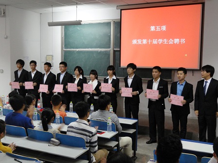 会议由第十届学生会秘书长郑瑶瑶主持,首先,第九届学生会主席王晓军做了工作总结,随后学院领导老师为第十届学生会“先进个人”、“十佳干事”和“优秀团体”颁发了证书,校学生会主席郑文涛又宣读《校学生会关于推特福利