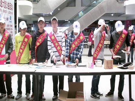 这次活动主要是为贫困地方的孩子募捐物资和慈善义卖,主要面向小朋友。因为是同龄人,小朋友之间更能产生共鸣。另一方面让小朋友参与进来,也是一次真真切切的爱心教育。了解了今天的活动计划,我们开始了分工。男生负责摆放展台和义卖的书籍,挂好宣传板。女生负责引导和图书义卖工作。于是,一个个带着青科大标志帽子的人穿梭于路边,行走在超市的各个楼层。宣传讲解,电梯引导还有图书义卖活动在我们的认真工作下井然有序的进行着。舞台上义务表演者进行着神奇的魔术,歌曲、舞蹈尽显其能,盲人医生还带来了精彩的萨克斯表演,一首《愚公移山》更是唱的让人感动,以此来感谢那些爱心参与者,感谢他们为贫困地区的孩子所做的一点一滴。此次活动受到了齐鲁晚报、青岛早报、新浪搜狐等多家网站的报道。