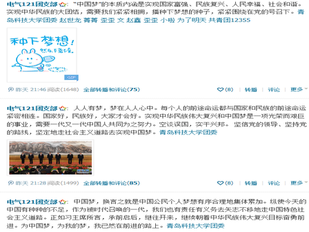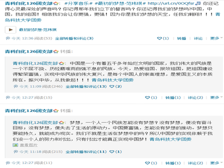 选手们分别围绕“走中国道路”、“ 弘扬中国精神”、“ 凝聚中国力量”等话题发表了看法,在展示他们个人风采的同时,也体现了当代大学生对社会、历史、人文、情感的关注与思考。各班级同学激烈转发评论,人人有梦,梦在人人心中。每一个中国人,不论性别、不论年龄、不论文化程度、不论市民农民……都可以有一个中国梦——一个向往美好、幸福的梦想。每个人的前途命运都与国家和民族的前途命运紧密相连,国家好,民族好,大家才会好。经过多日激烈的比拼,最终由自化6班获得第一名。