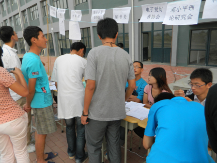 我们在下午2左右到达新校马上就开始了纳新场地的布置,3点左右纳新正式开始。各个部门和协会的负责人,热情的向大一的学弟学妹们介绍各部门或协会的情况和主要职能,以便学弟学妹们可以根据自己的兴趣和想要锻炼的方向等,选择适合自己的部门协会。新生们在学长们的帮助下,纷纷在对自己有帮助的协会留下了自己的联系方式。纳新活动一直持续到7点30才结束。然后,各部门和协会大约统计了今年的纳新人数,比往年更多。