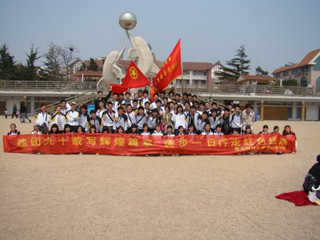院旗飘扬,迈着坚定的步伐,同学们沿着海岸开始行进,沿途向人们宣传建团史诗,歌颂赞扬我们的党和中国共青团,尽到只作为共青团员的责任。沿途同学们还自觉拣起海边的垃圾,保护海洋环境。