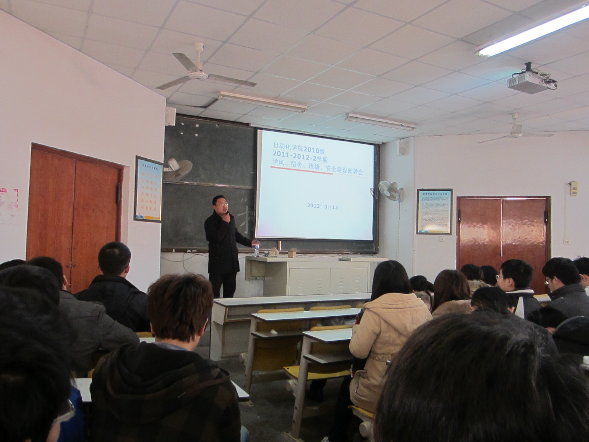 分团委副书记刘兆鹏老师在一教603主持召开自动化101—106班新学期的第一次会议。会上刘老师对2011-2012第一学期的2010级的整体表现作了总结,仔细分析了各个班级的学习、工作情况,并针对挂科率和四级通过率的原因作了重点强调,并对上学期同学们的表现作了表彰和批评。最后,刘老师还对学风、班风建设提出几点要求,鼓励同学们珍惜时间、树立目标、遵守纪律、认真学习。这次会议使广大同学了解到自身的现状,认识到自身的不足,为以后的发展指了方向。