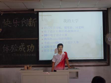 到场的嘉宾有已考入浙江大学研究生的张国锋,他曾参加过08、09年两届电子设计大赛并分别取得山东省二等奖和全国二等奖的好成绩。以及参加过“挑战杯”创业设计大赛并入围省级比赛的自动化095班的宋君明同学。首先,张国锋同学针对自己参加电子设计大赛的亲身体验对如何参加电子设计大赛、如何解决参赛时遇到的问题等问题一一作了详细解答,在场的同学们都认真的做了详细的笔记。在张同学讲话最后,他给在场的同学提出了几点可行的意见,让同学们在科技创新的过程中少走弯路。接下来是由宋君明同学对自己参加创业大赛的认识与感悟做了演讲,他就自己的参赛作品“太阳能热水器”做了讲解,他主要讲了参赛时发生的给自己留下深刻印象的事情,还有对自己的启发。