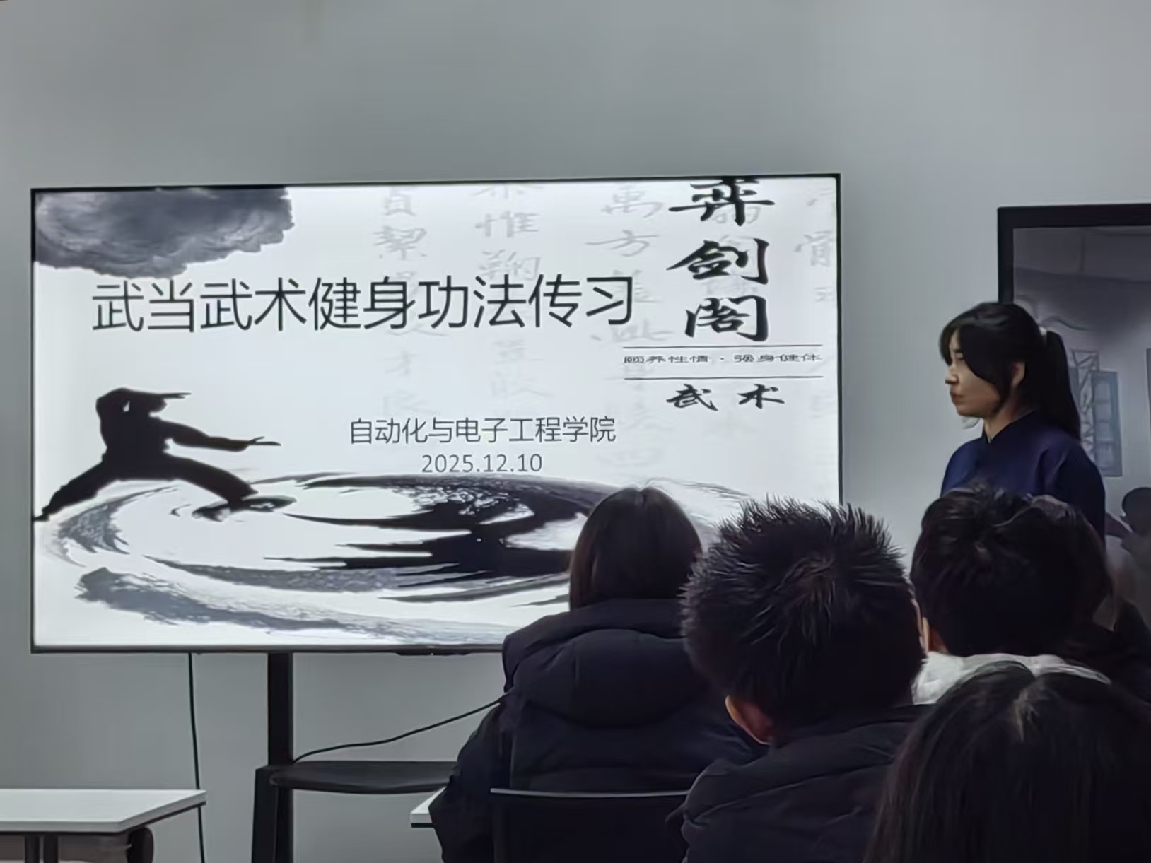弈剑阁武术协会负责人以生动的讲解和直观的演示,向同学们系统介绍了武当武术的历史渊源、文化内涵与健身价值。武当武术注重“内外兼修”,动作舒缓而流畅,尤其适合长期伏案学习的学生群体。她现场演示了武当基础功法中的几个代表性动作,如“舒筋活络式”“呼吸调息式”等,并邀请同学们上台体验。互动环节中,同学们在指导下尝试调整呼吸、舒展肢体,现场气氛轻松活跃。