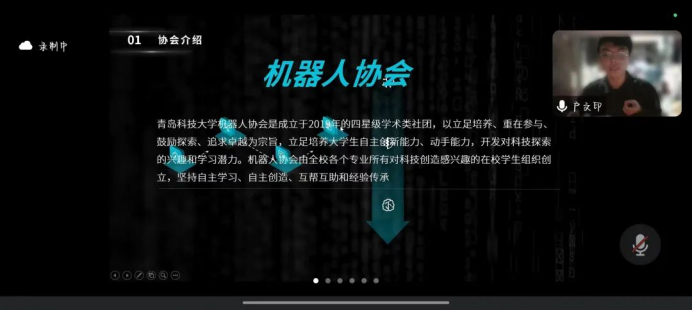 最后,机器人协会负责人、机器人211班户文印通过介绍机器人协会向新生们展示了科研的魅力。他从协会背景、成果展示、社团氛围三方面进行分享,提到协会旨在培养大学生自主创新能力,对科技探索的兴趣和学习潜力,极大的调动了同学们对科学的学习热情。