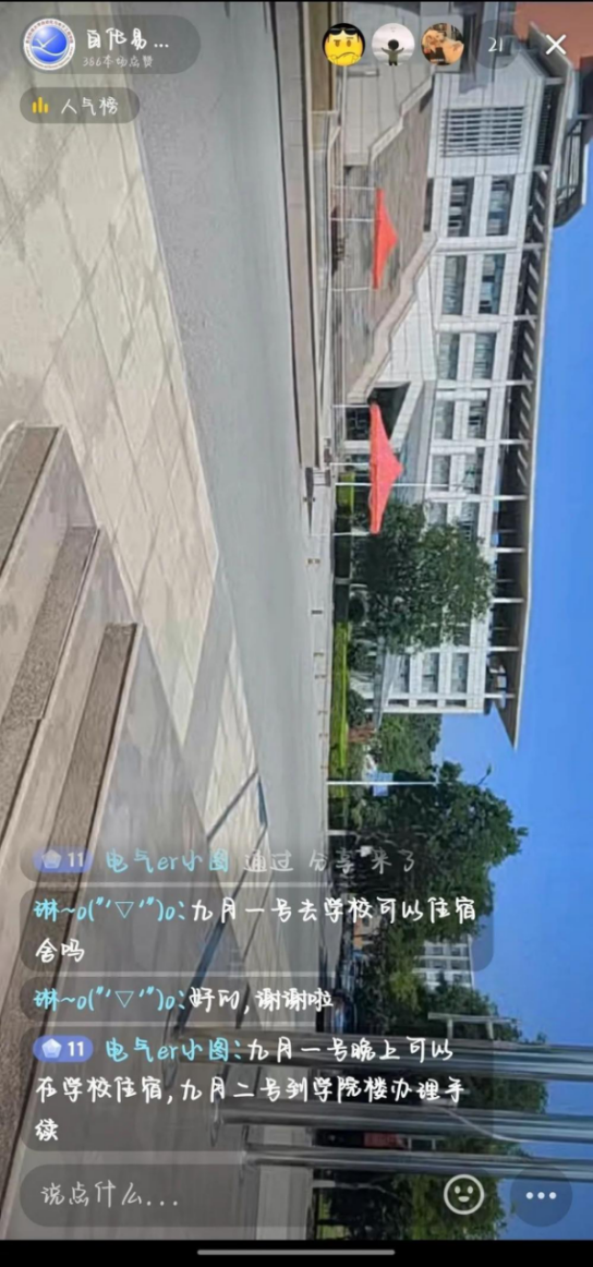 活动中,学长学姐们化身“校园云游主播”,轮流带领新同学云游览科大校园。从东门出发,依次经过学院楼、北苑食堂、北七宿舍、教学楼、南苑食堂、南一宿舍最后到达颐海苑,全方位讲述了学校功能区域分布与魅力景观。直播期间,新生们通过评论区互动实时提出问题困惑,获得学长学籍们的及时答疑。为帮助新生们更高效、便捷地于报到当日办理相关手续,学长学姐们还悉心讲解了报到区域、报到流程、志愿者岗位设置、家长休息区等迎新安排,鼓励同学们错峰出行,有序报到。