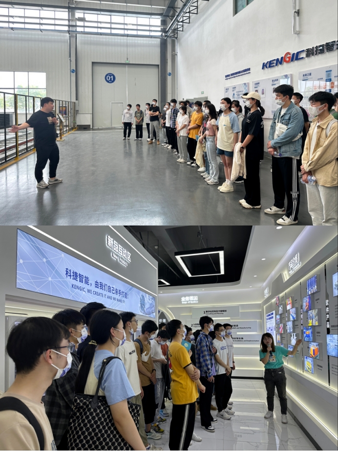 随后,师生一行走访我校大学生创新创业实习实践基地——科捷智能科技股份有限公司,在公司人力资源总监郭增水等人的陪同下参观了企业发展文化墙,并进入工厂参观智能物流和智能制造设备。